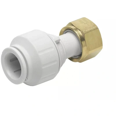 JG Speedfit straight tap connector push-fit fitting for the connection of plastic or copper pipes to fixtures or appliances with a MBSP connection point. The tap connector comes complete with a brass swivel nut and sealing washer. Simply push the push-fit fitting fully onto the pipe and twist the plastic nut clockwise to lock in place. To demount the connection, unlock the nut by hand and push the collet towards the body of the push-fit fitting and pull the pipe to release. The JG Speedfit straight tap connector is up to 40% faster to install than traditional methods and is easier to use in confined spaces by removing the need for hot works and tools. Designed, manufactured and assembled in the UK. Instant push-fit connection Install and demount in seconds without tools Safe flame-free installation, with no hot works, glue or flux Grip & Seal collet with stainless steel teeth and main O-Ring seal Twist & Lock mechanism secures fitting and adds compression Non-toxic, resists corrosion
