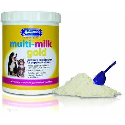 General description Johnsons Multi-Milk Gold is a premium milk replacer designed for puppies and kittens, providing young animals with an optimum start to life. It is ideal for orphaned pets or situations where the mother has insufficient milk, and serves as an effective weaning aid. Additionally, it acts as an excellent conditioner for adult dogs, cats, and other pets, making it a great pick-me-up after illness or pregnancy.