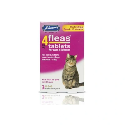 General description JVP 4 Fleas Cat Flea Tablets are specially formulated for cats and kittens, providing effective flea treatment. Each pack contains 3 tablets, designed to start killing fleas within 15 minutes and eliminate all fleas on your pet within 24 hours. Technical specifications Contains 3 tablets per pack For use with cats and kittens over 4 weeks of age Suitable for pets weighing between 1 kg and 11 kg