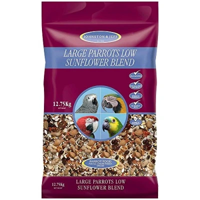 Low Sunflower for Large Parrots A low fat high nutrition, low fat blend for all larger Parrot Species including the large Macaws, Black Cockatoos and Moluccans 26 ingredients, 57% fruit and nuts - 7 different fruits, 6 different nuts Great value
