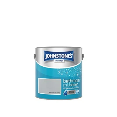 Johnstone's Bathroom Paint Manhattan Grey Mid Sheen Finish Stain Blocker Use in Moist & Damp Areas Low Odour Dry 1 2 Hours 12m2 Coverage per Litre 2.5L