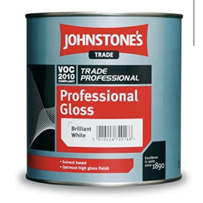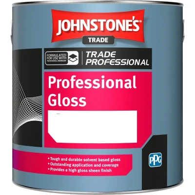 General description Johnstone's Trade Professional Gloss paint is a solvent-based, high-sheen finish designed for both interior and exterior applications on wood and metals. It is a tough, durable product that provides a high-gloss finish, ensuring surfaces remain whiter for longer with excellent application and coverage. Technical specifications Type: Solvent Based Finish: Gloss Coverage: Approximately 17 square metres per litre Recoat Time: 16-24 hours Compatibility and accessories Best used with Johnstone's Trade Professional Undercoat Usage Suitable for interior and exterior use Applicable on hardwood, iron, steel, softwood, timber, window frames, and wood