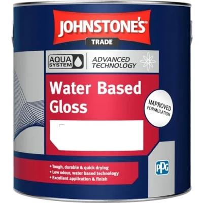 General description Johnstone's Trade Aqua Water Based Gloss is an innovative paint suitable for both interior and exterior applications on woods and metals. It offers the characteristics of a traditional solvent-based gloss while being water-based. Technical specifications Finish: Gloss Type: Water Based Coverage: 10-12 square metres per litre Touch dry: 1-2 hours Recoatable: 4-6 hours Compatibility and accessories Suitable for: Iron, Steel, Softwood, Timber, Wood Application methods: Brush, Roller or Spray