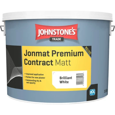 General description Johnstone's Trade Jonmat Premium Contract Matt paint is a high-quality yet economical premium contract matt emulsion. It provides excellent coverage of up to 16 square metres per litre, depending on the nature and porosity of the surface being painted, and has outstanding dry and wet opacity on interior walls and ceilings, leaving a permeable, breathable finish. Jonmat is ideal for use on new plaster or plasterboard, as well as aged plaster, wall boards, concrete, cement rendering, brickwork, and blockwork in internal situations. Technical specifications Coverage: up to 16 sqm per litre Recoat time: 2-4 hours Type: Water Based Finish: Matt Compatibility and accessories Suitable for use on: Blockwork, Brickwork, Cement Render, Concrete, Plaster, Wallboards Installation Application methods: Brush, Roller, and Spray