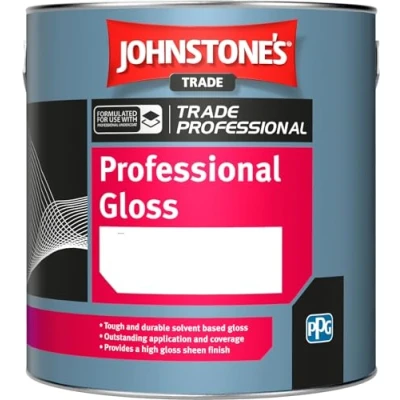 General description Johnstone's Trade Professional Gloss paint is a solvent-based, high-sheen finish suitable for both interior and exterior applications on wood and metals. It is designed to provide a tough, durable surface that maintains its high-gloss appearance and keeps surfaces looking whiter for longer. Technical specifications Type: Solvent Based Finish: Gloss Coverage: Approximately 17 square metres per litre Recoat time: 16-24 hours Compatibility and accessories Best used with Johnstone's Trade Professional Undercoat Available in thousands of colours via the Johnstone's Tinting System Usage Suitable for use on hardwood, iron, steel, softwood, timber, window frames, and wood surfaces