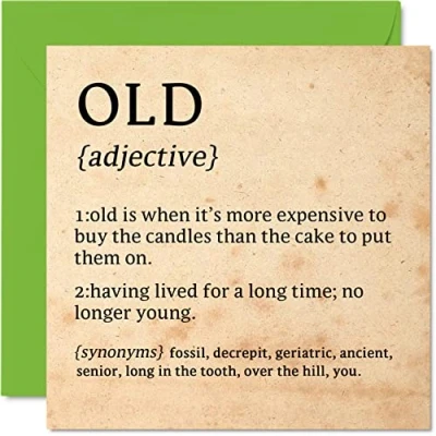 MAKE THEM SMILE WITH THIS FUNNY BIRTHDAY CARD: This exceptional quality birthday card for her or him shows the design "Definition of Old". If you are looking for fun birthday cards, then this happy birthday card is bound to make them smile. Not just for friendship gifts this could also be for Colleague, Brother, Sister, Cousin, Auntie or Uncle, Best Friend, Work Colleague, Mum, Grandma, Nan, Dad, Grandad, Nanny. WHAT DO YOU GET: The card is printed on one side and BLANK ON THE INSIDE to allow you to write your very own message. The unique fun design is printed on a specially sourced and environmentally responsible board. At 360 microns thick the natural white one-sided gloss board has a quality look and feel. Supplied with a coloured gummed envelope to complement the design and ready to be sealed and sent in the post. 40th birthday card for him, birthday card for Dad. NO INK SMUDGES: There is nothing worse than writing inside a card to find that the shiny surface makes the ink smudge. This is why we use a high quality one sided coated board. The uncoated side will absorb more of the ink from your pen to make smudging a thing of the past. Dad birthday cards, best friend birthday card, birthday card funny, rude birthday cards for women. SIZES: Greeting Card = 145mm x 145mm, Envelope = 155mm x 155mm, Card Thickness = 360 micron. Great friend birthday cards, male birthday card, 30th birthday card, happy birthday Dad cards, husband 50th birthday cards, stepdad birthday card. MADE AND QUALITY CHECKED IN THE UK: We print and manufacture all our product right her in the UK so you can be sure of a fast turnaround and a product that is expertly made. Using environmentally responsible premium board our card is conscious of the responsible management of the world's forests - 40th birthday cards for men, mens birthday cards, oldi card.