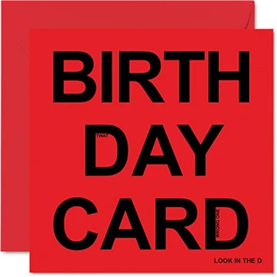 MAKE THEM SMILE WITH THIS FUNNY BIRTHDAY CARD: This exceptional quality birthday card for her or him shows the design "BIRTH DAY CARD". If you are looking for fun birthday cards for women, then then this happy birthday card is bound to make them smile. Not just for friendship gifts for women this could also be for Best Friend, Work Colleague, Mum, Grandma, Nan, Dad, Grandad, Nanny, Colleague, Brother, Sister, Cousin, Auntie or Uncle. WHAT DO YOU GET: The card is printed on one side and BLANK ON THE INSIDE to allow you to write your very own message. The unique fun design is printed on a specially sourced and environmentally responsible board. At 360 microns thick the natural white one-sided gloss board has a quality look and feel. Supplied with a coloured gummed envelope to complement the design and ready to be sealed and sent in the post. 40th birthday card for him, birthday card for Dad. NO INK SMUDGES: There is nothing worse than writing inside a card to find that the shiny surface makes the ink smudge. This is why we use a high quality one sided coated board. The uncoated side will absorb more of the ink from your pen to make smudging a thing of the past. Dad birthday cards, best friend birthday card, birthday card funny, rude birthday cards for women. SIZES: Greeting Card = 145mm x 145mm, Envelope = 155mm x 155mm, Card Thickness = 360 micron. Great friend birthday cards, male birthday card, 30th birthday card, happy birthday Dad cards, husband 50th birthday cards, stepdad birthday card. MADE AND QUALITY CHECKED IN THE UK: We print and manufacture all our product right her in the UK so you can be sure of a fast turnaround and a product that is expertly made. Using environmentally responsible premium board our card is conscious of the responsible management of the world's forests - 40th birthday cards for men, mens birthday cards, oldi card.