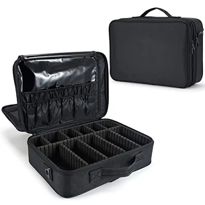 Large Makeup Bag: Our cosmetic bags features 10 adjustable EVA compartment dividers, creating 11 separate sections to tailor the storage space for your cosmetics and tools while on the go. On-the-Go Convenience: Our travel makeup bag features an adjustable strap and carry handle, providing four versatile carrying options: handbag, shoulder bag, backpack, or secured over a suitcase handle. Perfect for easy travel! Spacious Storage: Our makeup organiser bag boasts a triple-tiered design for ample storage. The top tier has a large net zipper pocket for hairdressing tools and palettes. The second tier features a brush holder for tidy makeup tools. The bottom tier keeps makeup and tools organized. Versatile Organizer: Measuring 40x29x12cm, this spacious makeup bag with compartments is ideal for organizing cosmetics, nail polishes, tools, essential oils, creams, and more. It's also perfect for storing chargers, cables, remote controls, and power banks. A versatile solution for all your storage needs. Perfect Present: A thoughtful gift for your wife, girlfriend, or mother, perfect for weddings, birthdays, Valentine's Day, and Christmas. Delivered with love.