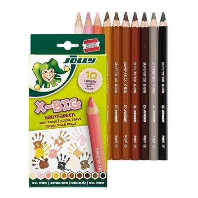 GREAT VARIETY Contains 10 vibrant skin colors specially designed for young artists and students to express their creativity and create realistic skin tones in their artwork. SHATTERPROOF & JUMBO SIZE The thick colored pencils are shatter-resistant and durable, which ensures long time use. Their jumbo size allows for easy and comfortable painting, ideal for small children's hands. BRIGHT COLOR INTENSIBILITY: The coloured pencils provide high colour intensity to make images shine and achieve an impressive result. The colours are vibrant and let creativity shine. Perfect for school and kindergarten: ideal for developing your artistic skills and learning in a playful way. The skin colours allow them to create diverse and unique works of art. HIGH QUALITY - The JOLLY X-Big skin coloured pencils are of high quality and have been specially designed for children. They are non-toxic and safe to use, so parents and teachers don't have to worry.