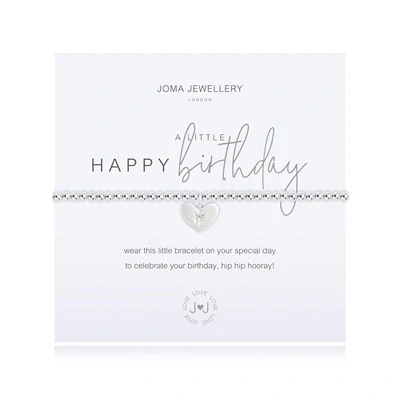 Bring a little joy to someone on their birthday with this beautiful Joma Jewellery bracelet. A beautiful stackable choice, this silver-plated bracelet features a silver heart charm, with a starburst star engraved in the centre and is embellished with a single white crystal. This sweet bracelet is displayed on a sweet card with the slogan A Little Happy Birthday with a cute poem saying, Wear this little bracelet on your special day, to celebrate your birthday, hip hip hooray!. Silver Plated Heart charm White crystal detail 17.5cm Stretch bracelet
