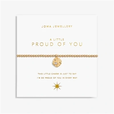 Show someone your pride with this beautiful bracelet from Joma Jewellery. Crafted with gold plating, this beaded bracelet features a circular charm in a hammered effect with a square-shaped white crystal. A beautiful gift choice to delight someone special, this bracelet is displayed on a card with the slogan ‘A Little Proud of You’, and a poem saying, ‘this little charm is just to say, I’m so proud of you in every way’.Gold platedHammered circle charmSquare-shaped white crystal17.5 cm stretch bracelet