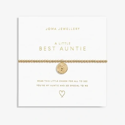 A Little Gold BEST AUNTIE Bracelet | 17.5cm stretch Every order is supplied with a beautiful Joma Jewellery gift bag finished with a gorgeous bow and ready to deliver a moment of happiness. Our loved ‘A Little’ collection is filled with pretty charms perfect for celebrating every special moment. Each lovely silver-plated bracelet is wrapped around a beautiful card, complete with a sweet poem and caring sentiment, the perfect present or little treat for a loved one or a celebration Product type : BRACELET Metal Type: No Metal Type Item Length: 17.5 centimeters