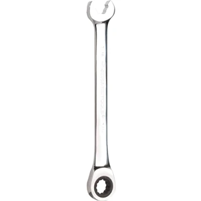 Dual-headed speed wrench with open end and ratcheting box end for tightening and loosening hex head nuts and bolts 7/16" opening at both ends Ratcheting box end has 12 points of contact for use with F-type connectors on splitters and all 7/16" connections Chrome vanadium steel construction with high-gloss finish provides durability and wear resistance 6-1/2" length