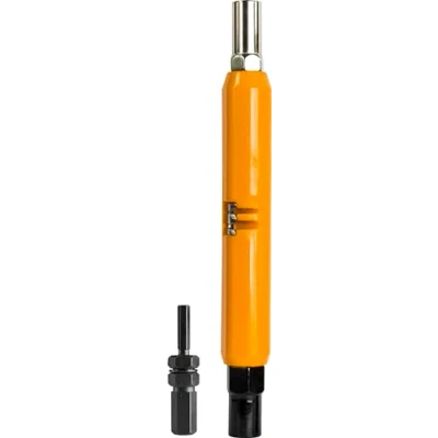Can wrench with wire stripper for placing fuses in cable terminals, connecting wires to fuses and binding posts, and opening telephone box fasteners to provide universal access to telephone boxes and pedestals Can wrench has black-oxide finished 7/16" socket, zinc plated 3/8" socket, and 1-1/4" socket depth Built-in wire stripper has two slots to fit the outside jacket of a four-wire quad and 22 AWG wire Reversible security key insert used to access tamper-proof cross-connect cabinets and other access points that have a 5/16" or 3/32" hex security screw 1" diameter octagonal handle prevents the tool from rolling when set down