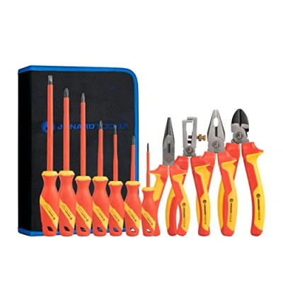 Insulated hand tool set manufactured to IEC 60900 standards for hazardous work environments Kit includes seven screwdrivers, three pairs of pliers, and one wire stripper Tested to 10,000 volts alternating current (VAC) and rated for 1,000 VAC live use Pliers and wire stripper have thumb guards between their handles to help protect user Wire stripper works on single conductor or stranded wire ranging in size from 8 to 30 gauge