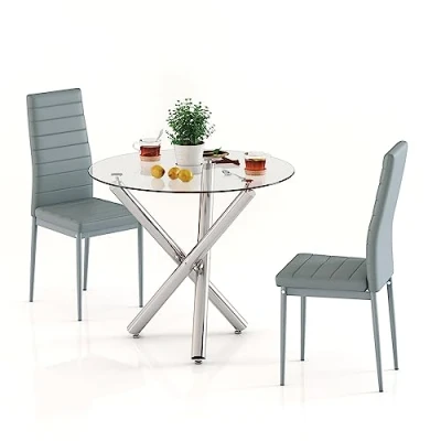 Jooli H Round Dining Table and Chairs Set 2, Glass Kitchen 2 Grey Faux PU Leather Modern Room Furniture