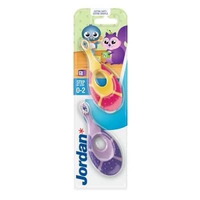 JORDAN BABY TOOTHBRUSH - The original brand for baby toothbrushes, designed for ages 0-2 years with extra soft bristles, a gentle biting ring for babies' gums, and a handle suitable for both adults and babies. Not made in China TAILORED FOR THE FIRST BRUSHING EXPERIENCE - The Jordan baby toothbrush step 1 is specifically crafted to ensure a positive first brushing experience. Its short neck and unique teeth ring prevent swallowing or pricking during brushing ESTABLISH HEALTHY DENTAL CARE ROUTINES - Start by making this toothbrush the first step in establishing healthy and happy dental care routines for your baby. The toddler toothbrush, suitable for ages 12 months and up, features a chewing grip to stimulate the baby's gums. (BPA and Phthalates Free) RECOMMENDED BY DENTISTS - Dentists recommend using the baby's first brush as soon as the very first tooth appears. The ergonomic handle with a good grip makes it comfortable for both baby and parents. Colored bristles indicate the amount of fluoride toothpaste to be used PACK OF KIDS TOOTHBRUSHES - This pack includes 4 units of kids' toothbrushes, each in different and amusing colors. Winner of the "Red Dot Design Award"