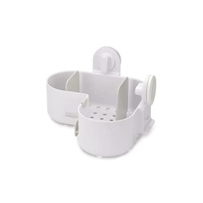 Easy tool-free installation using super-grip suckers Movable dividers for organised storage Hanging hook for sponges and flannels Self-draining design Easy to clean