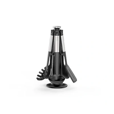 Joseph Elevate 5 piece Silicone Kitchen Utensils Carousel, BPA Free, Heat Resistant Non Stick Utensil Set, Weighted Stainless Steel Handles, Black and Silver