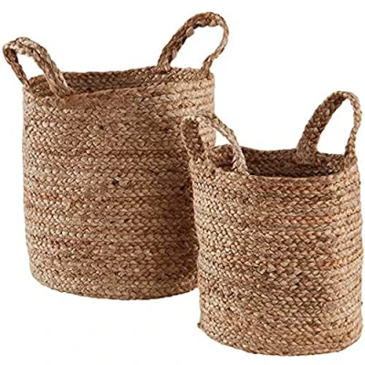 2 storage baskets made of jute wicker The pretty baskets with practical handles are of different sizes. Material: 100% Jute Size: height 25 cm, diameter 25 cm, height 20 cm, diameter 20 cm. Tip: If you use the basket as a planter, the plant pot should
