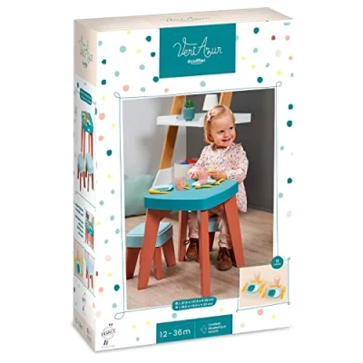 A dinner with friends: this table with 2 stools is decorated with 2 sets of cutlery, 2 glasses and 2 plates. Have a good dinner with a friend or girlfriend A TABLE LES PETITS 1 table in soft colours for children aged 12 months, equipped with 2 plates, 2 glasses, 2 cutlery sets and 2 stools to sit comfortably indoors and outdoors. The sustainable short circuit toy: Through the GREEN AZUR range, Jouets Ecoiffier wants to promote its commitments, and is part of an eco-responsible approach PLAY FOR BETTER GROW - It is by imitating adults and handling different toys that children learn to learn about the world around them, become more skillful and self-contained every day. Original toys from France guaranteed: Ecoiffier is a family company that manufactures all its toys in France., Manufacturer: Jouets Ecoiffier