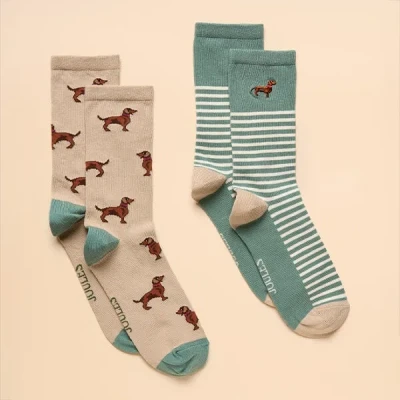 Whoever said socks make a boring gift, obviously weren't wearing the right ones. The Joules Khaki Cream Everyday Socks come in a pack of two and are designed to bring joy to your sock drawer.They're made from a supremely soft viscose blend that feels as good as it looks and has two different designs to choose from. The ribbed cuffs increase the comfort and stops them from falling down.Fits womens shoe size 4-8.Made from 68% Cotton, 30% Nylon, 2% Elastane.Machine washable.