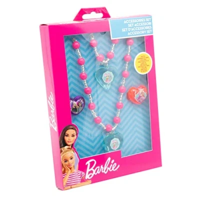 Barbie jewellery set Contents: 1 pearl bracelet with heart shaped pendant with barbie motif, 1 pearl necklace with heart-shaped pendant with barbie motif, necklace and 2 rings with cool barbie motifs In gift box 12 x 4 x 18 cm A optimum gift for any barbie fan A real eye-catcher on every child's hand Lifestyle: play and celebrate for children