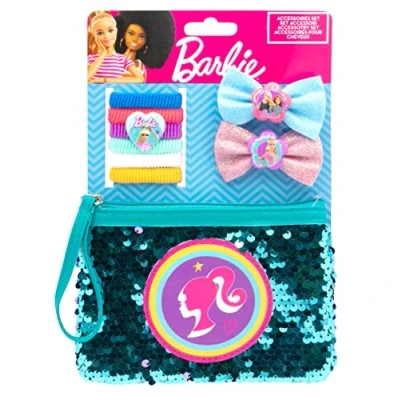 Barbie Set Contents: 6 braid holders (1 braid holder with heart-shaped pendant, 2 hair clips with flower-shaped pendant and glitter mesh and magical sequin beauty bag with cool Barbie patch On backing card 14.5 x 2 x 21 cm A great gift for any Barbie fan A real eye-catcher on children's hair