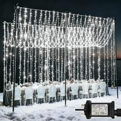 【6m x 3m Curtain Lights】 Transform any space with 600 LED hanging fairy lights (24 strands, 25 LEDs each strands). Perfect for gardens, wedding backdrops, and pergola decorations. Connect up to 4 units for a breathtaking 24m wide light display—ideal for event planners and commercial displays. 【8 Modes & Memory & Timer】 Create the perfect mood with 8 stunning settings(Combination, In Waves, Sequential, Slow glow,etc). Memory function remembers your last mode. 6H ON/18H OFF timer automatically lights up your patio, gazebo, or bedroom at the same time daily. Set once, enjoy forever. 【Waterproof & Safe 】 Low 31V voltage means LEDs stay cool to touch—no burns, no fire hazards. Safe for homes with children and playful pets. IP44 waterproof rating withstands rain, making these outdoor curtain lights reliable for garden parties and Christmas decorations. 【High Quality & Easy Installation】 Extra-long 5m lead cord reaches distant outdoor sockets with ease. Installation takes minutes: simply secure the main horizontal cable, then let the 24 fairy lights strands cascade naturally. Thicker, durable wires prevent breakage—no frustrating untangling. 【For Everyone & Every Occasion】 Home decor lovers—brighten your bedroom wall or living room window. Party planners—create stunning wedding backdrops and club displays. Garden enthusiasts—illuminate your patio, pergola, or gazebo. Personal space dreamers—add magic to your balcony or conservatory. One set, endless possibilities.