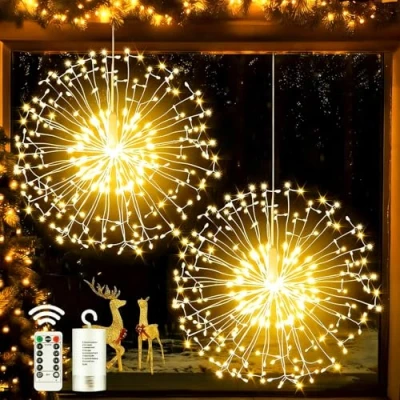 Joycome Firework Lights 2 Pack 198 LED Starburst Battery Operated, Christmas Hanging With Remote, 8 Modes Waterproof String for Outdoor Patio Tree Party Decorations Warm White