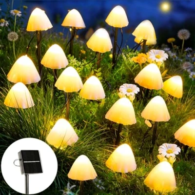 【20 LED Cute Mushroom Lights】The outdoor mushroom light are 16.5 feet long, equipped with 20 LED lights and the spacing of each mushroom lamp is 10 inches. The solar garden light with simulated mushroom design made of high-quality ABS plastic, which durable and natural, perfect for outdoor halloween decorations. 【Solar Garden Ornaments】The solar mushroom garden lights work by absorbing solar energy. Only need to place the solar panel in the full sunlight when it need to charg. Built-in 1.2V/600mAh AAA Ni-MH rechargeable battery, standard sunshine charging 6-8 hours at daytime, working 8-10 hours at night after fully charged. 【Safe to Touch & IP44 Waterproof】The solar garden lights will not overheat after prolonged use and are safe for children and pets to touch and can be safely attached to plants etc. The use of corrosion resistant ABS plastic material makes these solar mushroom lights long lasting and durable, they work well even in rainy and snowy day. 【Easy to Install】No addition tools required to install this toadstool solar lights outdoor garden. Please turn on the switch, then installing the parts and push the stake into the soil. Place it in direct sunlight and enjoy your garden decorations. It will automatically turn on or off after sensing the surrounding light. 【What Will You Get & Perfect Gift Choice】Package Included: 1 * 20 LED Solar Mushroom Lights, 1 * User Manual. These cute decorations lights in the shape of charming little mushroom design will beautifully dress up your yard patio garden party and other outdoor decor, creating a warm and sweet atmosphere to you and your family.