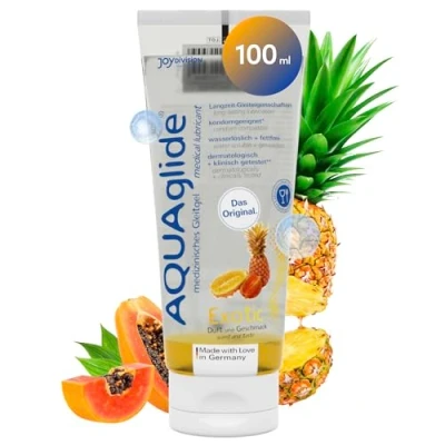 -AQUAglide Exotic - THE Original: An exciting combination that invites hours of passion. Highly effective and long-lasting: only a few drops are enough for the desired effect. No sticking or smearing: The premium lubricant is oil and grease-free and leaves no residue. Special delight - with Exotic flavor and scent - Vegan, food-grade, and sugar-free. Ideal also for oral indulgence. Safe and versatile to use: Dermatologically tested, water-soluble, particularly suitable for the vaginal area. pH-optimized (for intimate balance) and latex condom compatible. Made with love in Germany: Premium product manufactured in Germany, pleasantly sensitive and extremely skin-friendly.