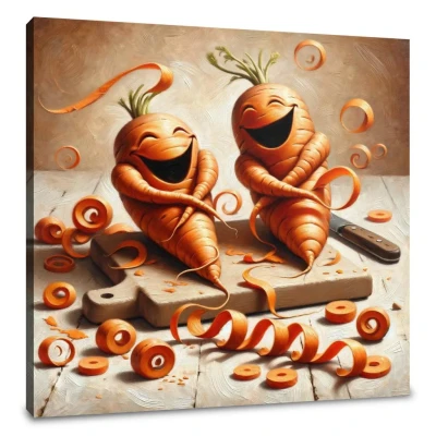 Home Art HavenJoyful Peel Canvas' portrays a pair of laughing carrots engaging in a whimsical preparation for soup, peeling their own skins into artistic swirls. Set on a light wooden chopping board and painted in soft orange and earthy tones, this impressionist artwork adds a playful and heartwarming touch to any kitchen or dining space.