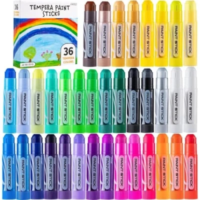 SUPER VALUE PACK. Our Vibrant and Quick Dry Paint Sticks for Kids/Children/Toddlers come with 36 Brilliant Colors(0.42oz/12g). These Non Toxic Colors include 24 classic colors, 6 metallic, and 6 neon colors. 36 COLORED STICKS BODY DESIGN: Our art paint stick is a visible stick color with the same paint inside that makes you choose paint colors easily. ASTM-D4236 APPROVED JOYIN PRIME TEMPERA PAINT COLORING SYSTEM: Kid-friendly and Non-Toxic. Our washable paint sticks are mess-free with no more wasted paint. These washable paint sticks for crafts can be easily washed out with soap and water. New colors will continue to be added for more variety. 36 PREMIUM PIGMENT TEXTURE PAINT: Our Tempera Paint Sticks include 36 rich colored paint sticks with classic, metallic, and neon colors. These quick-dry paint sticks have a crackless and flakeless texture after painting. This Washable Tempera Paints for Kids dries quickly in seconds and has Long-lasting vibrant colors! Our drying paint is perfect for parent-child Play period and a great essential kit for any arts and crafts paint project. FUN PAINTING IDEAS INCLUDE: Our tempera paint sticks for kids/children/toddlers are perfect for wood painting, chalkboard, and canvas. This sticks paint can be used for a variety of techniques like elbow and finger painting to explore creativity!