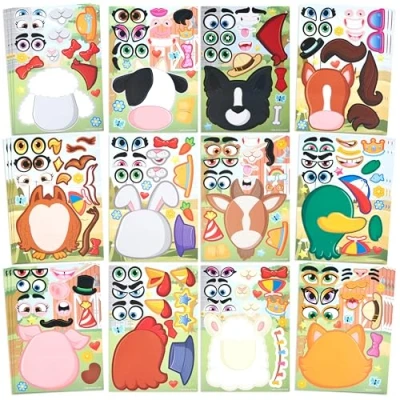 36 Sheets Farm Animals Theme Party Supplies Mix and Match Decoration Stickers. Pack Includes 12 Different Farm Animals with Multiple Colors. EXTREMELY FUN! Each Sheet has 3 Different Designs of Eyes, Mouths and Even Eyebrows to Make Whatever Silly or Cute Faces Your Kids Like. Enjoy Creativity and Fun to Your Party Celebration for Birthday and House Party, Group Activity, Art Class or other Activities. CREATIVITY and TEAM WORK! Perfect for Anyone to Freely Customize and Create the Face of Fantasy Animals. Also Good For Team Work for Kids to Play Together. RE-USABLE! The 9 Inches by 6 Inches Mix and Match Stickers are Made of High-Quality Paper Material. EXCEPTIONAL CARE: We're big on the little things. That's why customer safety and satisfaction are at the heart of everything we do. Contact us if products don't meet your expectations. We look forward to ensuring every moment brings you joy.