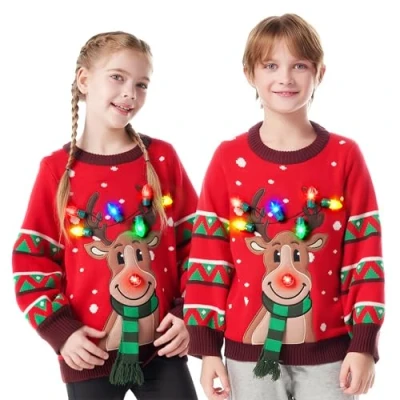JOYIN Kids Christmas Jumpers LED Light Up Reindeer Ugly Xmas Jumper Sweater Built in Bulbs for Girls Boys (Red S)
