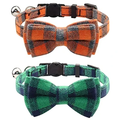 Joytale Cat Collar with Bell and Bow Tie, Quick Release Safety Collars for Kitten Cats, Soft Tartan Collar, 2 Pack, Green+Orange