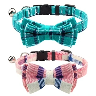 Joytale Cat Collar with Bell and Bow Tie, Quick Release Safety Collars for Kitten Cats, Soft Tartan Collar, 2 Pack, Pink+Teal