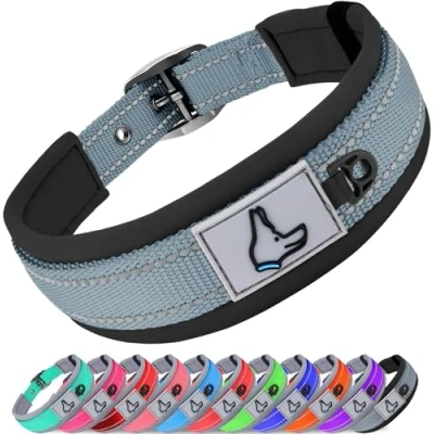 SIZE ATTENTION - Make sure to measure your dog’s neck before placing an order. Then refer to the sizing chart: Small 28-37cm | Medium 37-48cm | Large 48-58cm | X-Large 58-68cm |. DON'T CHOOSE SIZE BY WEIGHT AND BREEDS ONLY. Dog collar should be snug enough to fit two fingers between the dog's neck & collar NEOPRENE SOFT PADDING - The neoprene padded dog collar features extremely soft for comfy wear and can absorb the shock when wearing or pulling. With soft padding on the throat area for additional dog comfort. Also, come with quick-dry and odor resistance. You never worry about odor or water on the collar DOUBLE-LAYER WEBBING & REFLECTIVE STITCHING - Highly reflective threads are woven around the collar for 360°all-round protection and great visibility in the dark; Our nylon dog collar with two-ply construction for extra durability, works for Large & extra large dogs with strong pulling HEAVY DUTY BUT LIGHTWEIGHT - Made for all breeds from small to extra large dogs. Our heavy-duty dog collar features metal pin buckle and each adjustment hole is ringed with a metal grommet to increase the collar’s overall strength and durability to withstand the forces of most active and playful dogs DESIGN HIGHLIGHTS - D-Ring and Tag Loop. The D-ring can be used to attach our leash and that is tough enough to give peace of mind that it will not fail no matter how hard your dog likes to pull. Match ID tag, pendants or accessories to tag ring to make your paws stand out
