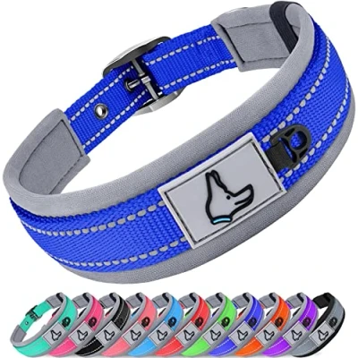 SIZE ATTENTION - Make sure to measure your dog’s neck before placing an order. Then refer to the sizing chart: Small 28-37cm | Medium 37-48cm | Large 48-58cm | X-Large 58-68cm |. DON'T CHOOSE SIZE BY WEIGHT AND BREEDS ONLY. Dog collar should be snug enough to fit two fingers between the dog's neck & collar NEOPRENE SOFT PADDING - The neoprene padded dog collar features extremely soft for comfy wear and can absorb the shock when wearing or pulling. With soft padding on the throat area for additional dog comfort. Also, come with quick-dry and odor resistance. You never worry about odor or water on the collar DOUBLE-LAYER WEBBING & REFLECTIVE STITCHING - Highly reflective threads are woven around the collar for 360°all-round protection and great visibility in the dark; Our nylon dog collar with two-ply construction for extra durability, works for Large & extra large dogs with strong pulling HEAVY DUTY BUT LIGHTWEIGHT - Made for all breeds from small to extra large dogs. Our heavy-duty dog collar features metal pin buckle and each adjustment hole is ringed with a metal grommet to increase the collar’s overall strength and durability to withstand the forces of most active and playful dogs DESIGN HIGHLIGHTS - D-Ring and Tag Loop. The D-ring can be used to attach our leash and that is tough enough to give peace of mind that it will not fail no matter how hard your dog likes to pull. Match ID tag, pendants or accessories to tag ring to make your paws stand out