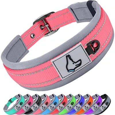 SIZE ATTENTION - Make sure to measure your dog’s neck before placing an order. Then refer to the sizing chart: Small 28-37cm | Medium 37-48cm | Large 48-58cm | X-Large 58-68cm |. DON'T CHOOSE SIZE BY WEIGHT AND BREEDS @@@HiK3ZRwlID5OkRTqkDKK+dUtQ62zUmu2@@@. Dog collar should be snug enough to fit two fingers between the dog's neck & collar NEOPRENE SOFT PADDING - The neoprene padded dog collar features extremely soft for comfy wear and can absorb the shock when wearing or pulling. With soft padding on the throat area for additional dog comfort. Also, come with quick-dry and odor resistance. You never worry about odor or water on the collar DOUBLE-LAYER WEBBING & REFLECTIVE STITCHING - Highly reflective threads are woven around the collar for 360°all-round protection and great visibility in the dark; Our nylon dog collar with two-ply construction for extra durability, works for Large & extra large dogs with strong pulling HEAVY DUTY BUT LIGHTWEIGHT - Made for all breeds from small to extra large dogs. Our heavy-duty dog collar features metal pin buckle and each adjustment hole is ringed with a metal grommet to increase the collar’s overall strength and durability to withstand the forces of most active and playful dogs DESIGN HIGHLIGHTS - D-Ring and Tag Loop. The D-ring can be used to attach our leash and that is tough enough to give peace of mind that it will not fail no matter how hard your dog likes to pull. Match ID tag, pendants or accessories to tag ring to make your paws stand out