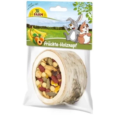 ✔ Pure natural – 100% natural feeding bowl made from untreated natural wood, filled with fruity JR Farm fruit salad. ✔ Aromatic combination – delicious bananas, pineapples and apricots with natural vitamins and minerals, combined with iron-containing beetroot and anti-inflammatory turmeric. ✔ Supports tooth abrasion – thanks to extensive gnawing on the wooden bowl. ✔ NATURAL FEED - All JR Farm products are GMO-free and free from artificial colours, flavours and preservatives. ✔ Made in Germany - In our agricultural company, we grow many raw materials on meadows and fields ourselves and can thus guarantee the best quality from Bavaria.
