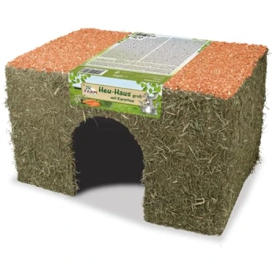 ✔ Pure natural – covered with aromatic mountain meadow hay and a delicious roof with crisp carrot pieces. ✔ Supports tooth abrasion – contains a high raw fibre content, which supports the physiological abrasion of life-growing rodent teeth when nibbling. ✔ High-quality ingredients – thanks to natural raw materials, the hay house can be completely consumed. ✔ Dimensions – W 37 cm, D 24 cm, H 21 cm – therefore particularly suitable for dwarf rabbits. ✔ NATURAL FEED - All JR Farm products are GMO-free and free from artificial colours, flavours and preservatives.