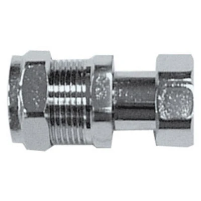 This straight tap connector is chrome plated with compression ends. It is ideal for hot and cold water services, including heating installations in domestic settings. The connector offers versatility with a range of sizes available. The JTM Chrome Compression Straight Tap Connector measures 22mm x 3/4 inch. It ensures compatibility with various plumbing systems, providing reliability and durability. Suitable for both new installations and replacements, this connector is designed to perform efficiently in domestic applications. Its chrome finish adds a sleek appearance while ensuring resistance to corrosion. This tap connector is a practical choice for maintaining water flow and system integrity in any home plumbing setup.. JTM Chrome Compression Straight Tap Connector - 22mm x 3/4 Inch Brass Chrome Plated