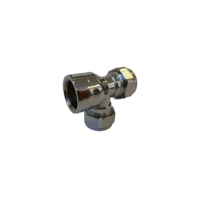 The JTM Chrome Compression Threaded Tee measures 15mm x 15mm x 1/2 inch (branch) and is a durable, versatile plumbing fitting suitable for varied applications. Its sleek chrome finish not only adds aesthetic value but also resists corrosion. The compression design ensures a secure, leak-proof connection, ideal for residential and commercial systems. The 1/2 inch threaded branch offers flexibility for integration with other threaded fixtures, enabling a seamless installation. Made from robust materials, it delivers long-lasting performance and reliability. Its precise engineering ensures snug fitting, reducing leak risks and maintaining integrity. Suitable for hot and cold water systems, it handles diverse pressures and temperatures. Whether for upgrades or new installations, the JTM Chrome Compression Threaded Tee guarantees exceptional performance and ease of use, ensuring a smooth plumbing experience. Image is for illustration only, with the 1/2 inch thread on the (centre) branch.. JTM Chrome Compression Threaded Tee - 15mm x 15mm x 1/2 Inch (Branch) Brass Chrome Plated