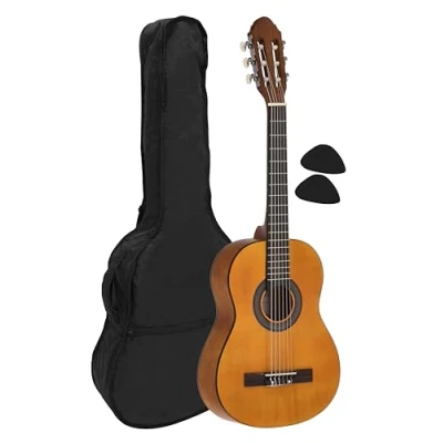 Proven and popular for many years: The Navarrez classical guitar has been one of our bestsellers for many years – a reliable instrument for beginners, advanced players and stage performers. It is available in 3 different sizes. Scope of delivery: Honey guitar 1/2 (for children from approx. 7 years) - overall length 85.5 cm / lower bout width 23.5 cm / body depth 9 cm / nut width 42 mm / scale length 56 cm, bag Clear sound thanks to basswood: With a body and top made of carefully processed basswood, this classic guitar impresses with a balanced sound and robust construction. Available in two attractive colour variants: honey-coloured or black. High processing quality: Each Navarrez guitar is manufactured under strict quality standards – for a precisely tuned instrument that is delivered ready to play and reliably. High-quality finish: The fine, water-based lacquer gives the guitar a glossy finish and protects the surface permanently – a real eye-catcher in any music room or studio. Flexible accessory options: Choose between the version with a lightly padded carrying bag (incl. rucksack straps and music pocket) or the comprehensive starter set with bag, multilingual tutorial book, tuner and plectrums – for a quick start.