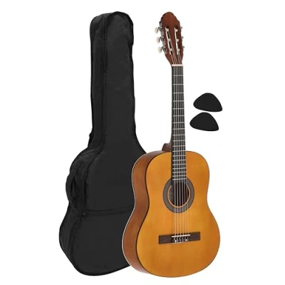 Proven and popular for many years: The Navarrez classical guitar has been one of our bestsellers for many years – a reliable instrument for beginners, advanced players and stage performers. It is available in 3 different sizes. Scope of delivery: Honey guitar 3/4 (for children from approx. 9 years) - overall length 90 cm / lower bout width 35 cm / body depth 9.5 cm / nut width 42 mm / scale length 58 cm, bag Clear sound thanks to basswood: With a body and top made of carefully processed basswood, this classic guitar impresses with a balanced sound and robust construction. Available in two attractive colour variants: honey-coloured or black. High processing quality: Each Navarrez guitar is manufactured under strict quality standards – for a precisely tuned instrument that is delivered ready to play and reliably. High-quality finish: The fine, water-based lacquer gives the guitar a glossy finish and protects the surface permanently – a real eye-catcher in any music room or studio. Flexible accessory options: Choose between the version with a lightly padded carrying bag (incl. rucksack straps and music pocket) or the comprehensive starter set with bag, multilingual tutorial book, tuner and plectrums – for a quick start.