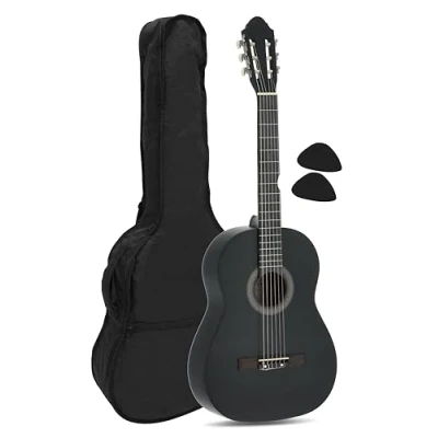 Proven and popular for many years: The Navarrez classical guitar has been one of our bestsellers for many years – a reliable instrument for beginners, advanced players and stage performers. It is available in 3 different sizes. Scope of delivery: Black guitar 4/4 (for children from approx. 14 years and adults) - overall length 99.5 cm / lower bout width 37 cm / body depth 10.5 cm / nut width 52 mm / scale length 65 cm, bag Clear sound thanks to basswood: With a body and top made of carefully processed basswood, this classic guitar impresses with a balanced sound and robust construction. Available in two attractive colour variants: honey-coloured or black. High processing quality: Each Navarrez guitar is manufactured under strict quality standards – for a precisely tuned instrument that is delivered ready to play and reliably. High-quality finish: The fine, water-based lacquer gives the guitar a glossy finish and protects the surface permanently – a real eye-catcher in any music room or studio. Flexible accessory options: Choose between the version with a lightly padded carrying bag (incl. rucksack straps and music pocket) or the comprehensive starter set with bag, multilingual tutorial book, tuner and plectrums – for a quick start.