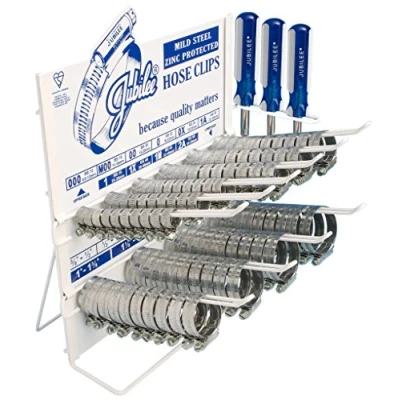General description These Original Range Jubilee® Clips, made from zinc protected mild steel, are the most popular clips in Jubilee's range. They are designed for a variety of applications including automotive, agricultural, pneumatic, hydraulic, hardware/DIY, and construction uses. The Jubilee Clip point of sales dispensers offer convenient countertop and wall-mounted displays, allowing for easy access to a small stock of Jubilee® products. Technical specifications Material: Zinc protected mild steel Adjustment range: 9.5mm to 50mm Contents: 100 Jubilee® Clips (10 each of sizes 000, M00, 00, 0, 0X, 1A, 1, 1X, 1M, and 2A) Includes: 3 Jubilee Flexidrivers®