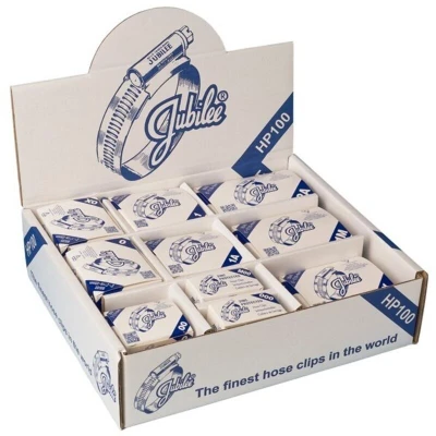 General description This Jubilee® Handy Pack includes 100 clips with ten each of the ten most popular sizes, facilitating connections from 9.5mm up to 50mm. The robust and smart cardboard outer pack is suitable for an end user or as a point of sale. The Jubilee® Handy pack can be used as a counter point of sale dispenser or mobile stock pack. Technical specifications Contains 10 of each of the following mild steel clips: 000: 9.5-12mm M00: 11-16mm 00: 13-20mm 0: 16-22mm 0X: 18-25mm 1A: 22-30mm 1: 25-35mm 1X: 30-40mm 1M: 32-45mm 2A: 35-50mm